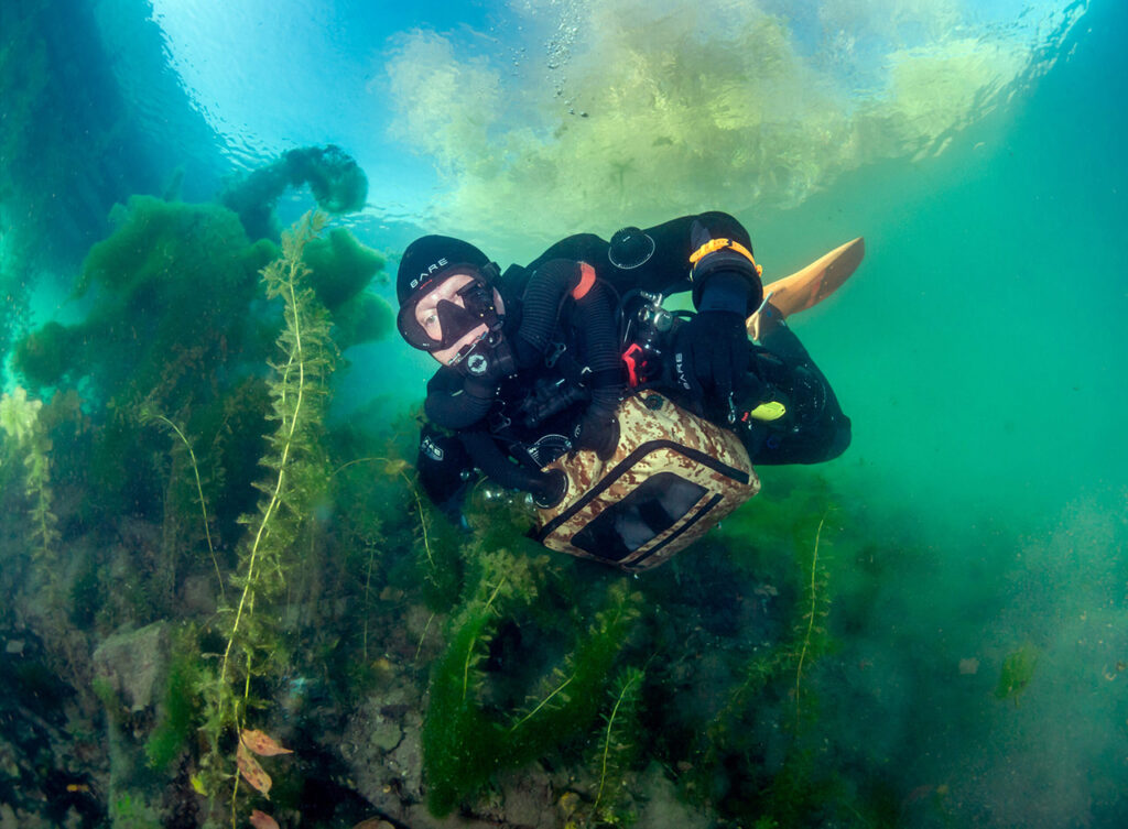 “…. Once you’re diving the unit sort of disappears. It’s out of your eye line and you have nothing on your back. You feel almost naked… I can get through the tiniest little holes with the unit and I’m working up to trying to get thru actual restrictions in superman with the unit over my head……”. Full customer review here.